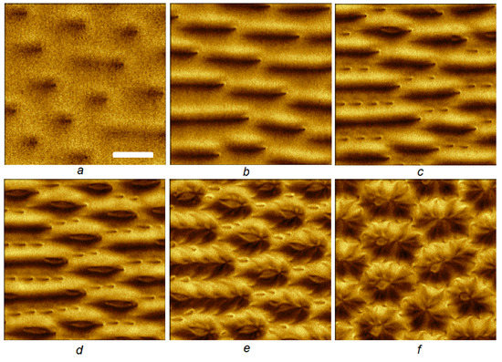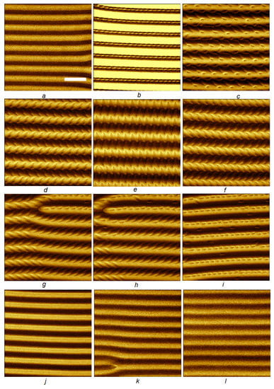 When the sign of the external field is reversed, the angle of the protruding wedges changes (Figure 2d–f). It should be noted that when watching movies, one can sometimes see a jitter of the picture—a shift of domains up and down (in the vertical direction). This is not related to errors in the positioning of the scanning field; it is constant throughout the entire series with an accuracy of 10–20 nm. The magnetization reversal is associated with the motion of defects in the stripe domain structure, e.g., magnetic dislocations [30]. This can be observed most clearly over a larger area during magneto-optical registration based on the Faraday effect (see the movie –––– in Supplementary Materials). Sometimes, the movement of a dislocation (Figure 2g,h) enters the MFM scan area. It causes deformation of the stripe DS and vertical displacement of the neighboring domains. In the case when a dislocation passes outside the scanning region, we see only a shift in the domain structure. Note that in the case shown in Figure 2, the motion of a magnetic dislocation is associated with a change in the type of longitudinal modulation from two-sided (Figure 2g) to one-sided, and then to point structure (Figure 2h,i). Each of these transformations is accompanied by a decrease in the period of the stripe DS. At zero external magnetic field, the period is 3.84 m, while in a field of 410 Oe, the period is 1.6 times smaller and is about 2.39 m.