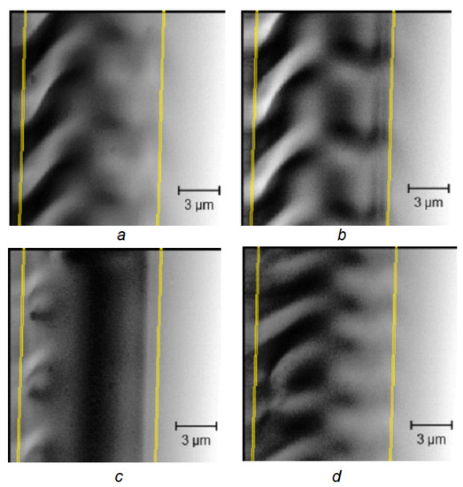 We performed similar measurements in an external magnetic field directed perpendicular to the film surface (see the movie –– in Supplementary Materials). Figure 4 shows some of the obtained MFM images. The lines indicate the approximate positions of the boundaries of the magnetic film with the substrate placed on the right and air on the left from the garnet layer. At the zero field, on the film side adjacent to the boundary with air, light and dark domains are seen, inclined with respect to the surface normal (Figure 4a). As the field increases, the domains adjacent to the boundary with the substrate (Figure 4b) also become clearly visible. At higher fields, one can observe domains located at some distance from the film/air interface (Figure 4c), which correlate with the results of the previous experiment. The scan obtained after the magnetic field was again turned to zero (d) shows that the period of the domain structure has changed, branching of one of the domains is observed, and a separate near-surface domain has appeared at the boundary with air in the region of this branching.