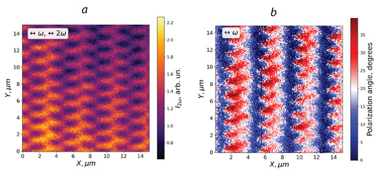 Figure 5a shows the SHG microscopy image of the studied garnet film with the stripe domains oriented in the vertical direction. The excitation of the film was performed by linearly polarized radiation of the Ti-sap laser with the polarization plane perpendicular to the stripe domains, and the SHG radiation with similar polarization was detected, as shown by the arrows. One can see that the SHG pattern reveals two periods: (i) of approximately 4 m along the X axis that corresponds to the stripe domains, and (ii) of about 1.6 m along the Y axis with a zigzag shape; the coordinate frame is indicated in the figure. It is worth noting the contrast in the SHG pattern appears due to high values of the magnetization-induced modulation of the SHG intensity intrinsic to this method [37], in which the amplitude of the magnetization-induced contribution of the SHG field that is odd with respect to the magnetization M, can be of the same order of magnitude as the nonmagnetic (crystallographic) one, . As a result, due to the presence of residual magnetization, the SHG intensity is given by the expression =. Changing the direction of M leads to the appearance of the magnetic contrast of the SHG intensity, , which can reach the values of dozens of percents. Such an effect allows to figure out the residual magnetic domain structure of the studied garnet film.
