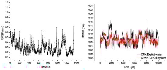 RMSF (left) and RMSD (right) for ciprofloxacin molecule inside the active site (CPX:hTOPO-II) and out of the active site of the topoisomerase-II enzyme (CPX: explicit water).