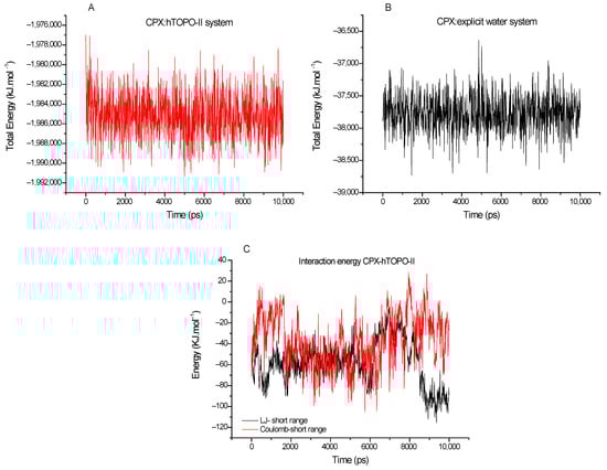 Energy graphs extracted from MD simulations. (A,B) Total energy variation for the CPX:hTOPO-II and CPX:explicit water systems, respectively. (C) Interaction energy graph for the CPX:hTOPO-II complex. In C, the black line corresponds to Coulombic-type interactions while the red line corresponds to Lennard-Jones-type interaction energy.