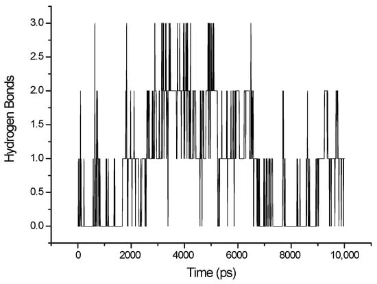 The hydrogen bonds formed between CPX and hTOPO-II β were the main interactions responsible for the stability of the molecule in the enzyme active site, as shown in Table 1., This details the main residues that participated in the intermolecular interactions for the representative conformations selected by the OWSCA algorithm. Additionally, the number of hydrogen bonds formed during the MD simulation for all frames is shown in Figure 3. By analyzing the figure, it can be observed that the CPX shows three hydrogen bonds with hTOPO-IIβ, two of which are quite frequent during most of the simulation time.