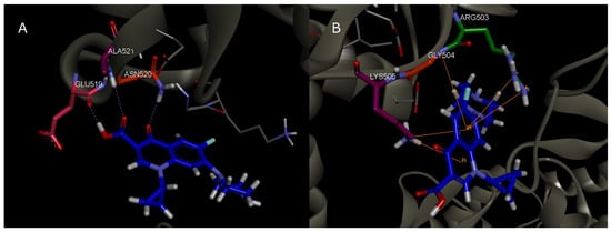 Intermolecular interactions during molecular dynamics simulation. (A) Hydrogen bonds formed between CPX and the amino acids Glu 519, Asn 520, and Ala 521 at 3200 ps of simulation. (B) π-π stacking interactions between CPX and amino acids Arg 503, Lis 505, and Glu 504 at 7900 ps of simulation.