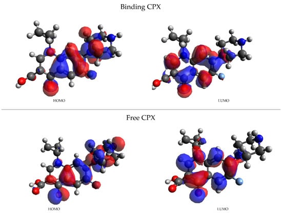 HOMO–LUMO frontier orbital representations for ciprofloxacin molecule in two different environments: in the enzyme active site (binding CPX), and in water (free CPX).