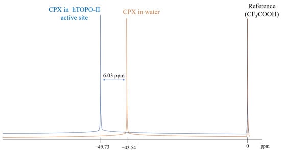 Theoretical calculations of 19F NMR chemical shifts were performed to investigate whether the specific interaction of CPX with the hTOPO-IIβ enzyme can be used as a biologic human topoisomerase identifier. Table 2 contains the average of the calculated values for the theoretical 19F NMR shifts in all tested systems. The data show a high similarity between the experimental value and the theoretical value obtained for CPX in the CPX:explicit water system. The low Δδ value indicates that the method and the level of theory selected are very accurate for this type of calculation []. Secondly, the data show that the value obtained in the calculation using the implicit solvation model, CPX:implicit water, is far from the experimental value. It is worth mentioning that results for the system CPX:implicit are similar to values obtained for CPX in a vacuum. Such results indicate that explicit solvation is adequate for representing the solvent effect on CPX. It can also be inferred that the explicit presence of the water molecules in the calculation is important since it creates the proper hydrogen bonding network of water molecules for calculating 19F NMR spectroscopic parameters []. As mentioned, the fluorine nucleus has a high sensitivity when compared to the 13C and 15N nuclei, being almost as sensitive as 1H []. In this context, although solvent exposure effects can be difficult to observe in nuclei such as 13C and 15N NMR, for the 19F nucleus, solvent-induced isotopic shifts can be as high as 0.25 ppm, offering an efficient way to probe solvent exposure [].
