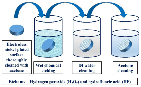 The schematic of chemical treatment and surface cleaning is shown in Figure 1. The nickel-plated surface was cleaned before and completely immersed in the chemical solutions and taken out after the prescribed times. The chemically treated samples were washed with deionized water and then thoroughly cleaned using acetone.