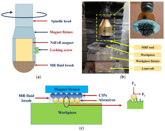 The electroless nickel-plated surfaces are finished using different techniques such as single point diamond turning (SPDT), magnetorheological finishing (MRF), and chemical mechanical polishing (CMP). The major problem with SPDT is the tool marks on the finished surface that limit the use of mirrors in the ultraviolet-visible (UV) spectrum. Both MRF and CMP are successfully utilized for the finishing of nickel and its alloys. However, certain drawbacks of these processes, such as limitations on the workpiece geometry in the CMP and higher abrading forces in the MRF, can be eliminated with the help of magnetorheological finishing after chemical treatment [5]. Magnetorheological finishing (MRF) is a precision finishing technique for optical components. This process can be used to finish different workpiece materials varying in shapes and sizes [6,7,8]. The MRF process is carried out in the presence of magnetorheological (MR) fluid, which consists of carbonyl iron particles (CIPs) and abrasive particles thoroughly mixed in a carrier liquid [9]. The CIPs are magnetic and are responsible for magnetorheological effects. The abrasive particles are non-magnetic and help in material removal by mechanical action. The additives are added to the fluid depending upon the applications. The MR fluid shows the behaviour of a Newtonian viscous fluid in the absence of a magnetic field [10]. Introducing a magnetic field leads to the magnetization of CIP particles [11] and chain-like structures are created along the magnetic flux lines [12]. The behaviour of MR fluid in the presence of a magnetic field is similar to that of viscoplastic fluid. Material removal occurs when the workpiece comes into contact with stiffened MR fluid. The penetration of abrasive particles and shearing action lead to material removal. The MRF process is also used for finishing of brittle and ductile materials [13,14,15]. With the development of the process, chemicals are also used in magnetorheological finishing to assist in material removal. However, the material removal rate is mainly affected by process parameters, MR fluid composition, and workpiece material properties.