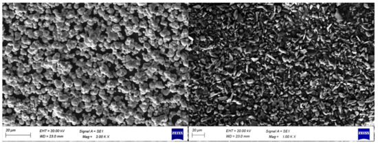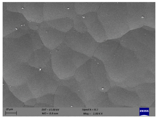 The morphology of the electroless nickel-plated surface is shown in Figure 4. It can be seen from the SEM image that the appearance of plating is uniform and homogenous. The texture of the plated surface is wavy and has bigger cells. However, isolated white impurities are observed on the surface that can be related to organic contaminants present in the nickel–phosphorus bath. During the electroless plating, these contaminants were deposited on the surface at scattered locations.