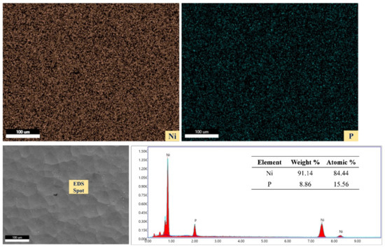 Energy dispersive X-ray spectroscopy (EDS) area mapping was carried out on the as-plated surface to understand the distribution of plated elements, and the spot analysis was performed to ascertain the concentration of the major and minor elements. Figure 5 shows the elemental area mapping and spot analysis of the as-plated surface. The weight percentages of nickel and phosphorus were found to be approximately 91% and 9%, respectively. The phosphorus content in the plated surface was at a medium level, which suggests that this surface has reasonable hardness and better corrosion resistant.