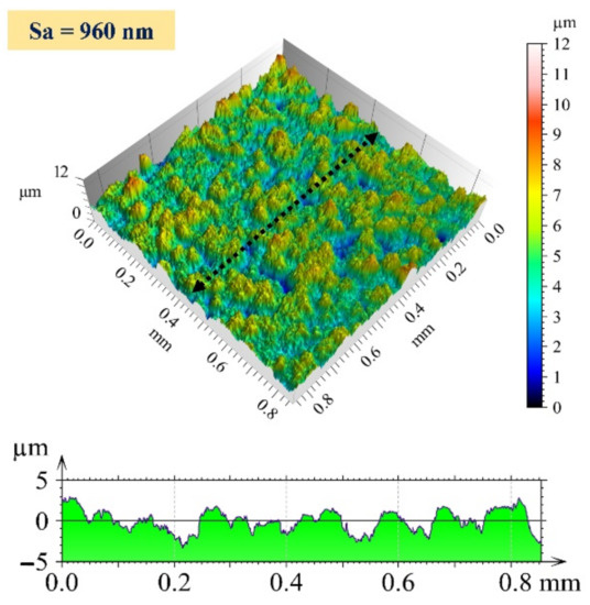The topography of the as-plated surface is shown in Figure 6. The average areal surface roughness (Sa) of the surface was found to be 960 nm. The surface is rough and has an uneven distribution of peaks and valleys. The surface roughness of the plated surface is directly related to the constituents of the nickel bath during the electroless plating process.