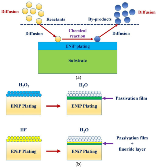 During wet chemical treatment, the surface chemistry changed owing to different chemical reactions taking place between the chemicals and the surface. The chemical reaction took place by diffusion of chemicals on the surface, redox (oxidation–reduction) reaction between the chemical and workpiece surface, and by-product diffusion. Figure 7a shows a schematic of the series of reactions taking place during chemical treatment. Figure 7b shows a schematic of the chemical reaction of H2O2 and HF with the workpiece surface. A passivation layer was formed during the interaction of the plated surface with the diluted H2O2 and HF. The oxides were formed when the surface interacted with H2O2. The oxidation–reduction (redox) reactions are provided below: