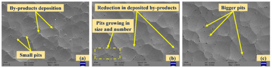 The SEM images of chemically treated surfaces with 15% H2O2 are shown in Figure 8. It can be clearly seen from Figure 8a that the reaction of H2O2 results in the formation of pits. Moreover, deposition of by-products was also observed when exposure was carried out for 10 min. These are similar to islands or nodules [27]. As the chemical reaction time increased, these deposited by-products were removed by the chemicals and the number of pits and their size increased (Figure 8b). After 30 min of treatment, these deposits were almost gone, but bigger pits could be seen (Figure 8c). Using image processing software ImageJ, it is found that the average size of pits after chemical treatment of 20 and 30 min was 0.65 µm and 2.38 µm, respectively.