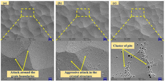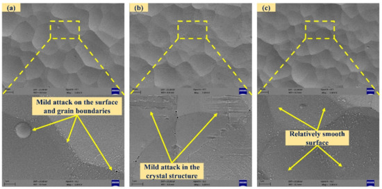 At lower magnification, the change in the microstructure of the chemically treated surface is not differentiable for HF treatment. However, the detailed features on the surfaces are observed at higher magnification. A lower concentration of HF is less likely to generate higher by-products. Figure 9a,b shows that the surface treated with 1% HF for 10 min and 20 min where scattered deposition with pores around the grain boundaries was observed. After the 30 min chemical treatment duration (Figure 9c), the surface was relatively smooth with the removal of deposited by-products but ridge-kind features were observed. The nickel–plated amorphous structure was easily etched by HF, whereas the crystalline structure had high etch resistance.