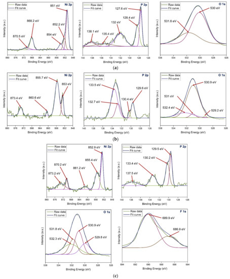 Figure 11c presents the XPS spectra (Ni 2p, P 2p, O 1s, and F 1s) of the surface chemically treated with HF. In the Ni 2p spectra, the peak observed at 852.9 eV indicates Ni 2p3/2 [33]. The peaks observed at 855.4 eV and 861.2 eV indicate Ni2+ 2p3/2 [31]. The other peaks at 870.2 eV and 873.2 eV correspond to Ni2+ 2p3/2 and NiP 2p1/2, respectively. In the P 2p spectrum, peaks at 129.5 eV, 130.2 eV, and 133.4 eV correspond to P3+ 2p3/2, NiP 2p1/2, and P5+ 2p3/2, respectively [33]. The satellite peak appeared at 137.5 eV. In the O 1s spectrum, peaks at 530.9 eV and 532.3 eV correspond to NiO and P2O5, respectively. The peaks at the binding energies of 529.8 eV and 531.8 eV are observed due to hydroxyl groups present on the surface [29]. In the F 1s spectrum, peaks at 686.9 eV and 689.9 eV correspond to PF3 and NiF2, respectively.