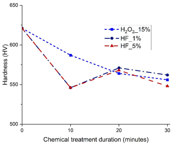 The microhardness of the chemically treated surfaces was lower than that of the as-plated surface, as shown in Figure 12. It was observed that the chemical treatment with H2O2 results in a continuous drop in hardness due to the formation of an oxide layer, which is softer than the as-plated surface. Moreover, the size and number of pits also increased with more chemical treatment duration, and it reduced the hardness further. The HF treatment resulted in the formation of both passivation and chemical films and the lowest hardness was observed after 10 min of exposure. In 10 to 20 min of chemical exposure, chemical and passivation films degraded and consequently the hardness increased due to resurfacing of the base material. After 30 min of chemical treatment, the hardness decreased where the chemically treated surface with 1% HF showed higher values owing to a group of pits that developed on the chemically treated surface with 5% HF. The decrease in hardness after 30 min of chemical treatment can be attributed to dissolution nature of nickel and phosphorus in the HF solution. The surface dissolution leads to structural modification of the exposed surface [34]. Moreover, the change in the concentration of nickel and phosphorus affect the mechanical properties of the surface layer [35].