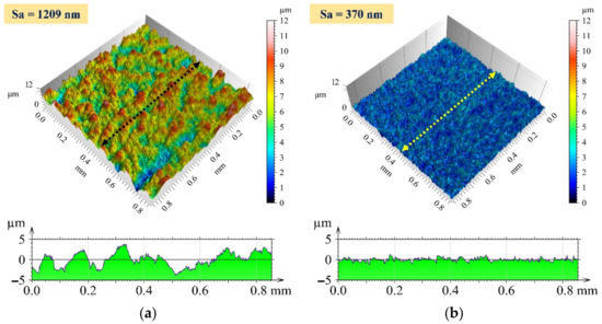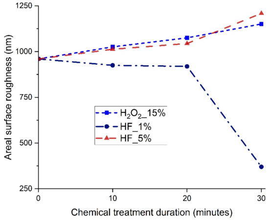 The areal surface roughness of the chemically treated surfaces with 15% H2O2 and 5% HF increased with chemical treatment duration, whereas it decreased with 1% HF, as shown in Figure 13. This can be related to pit formation and aggressive attack by HF at higher concentrations, which deteriorate the surface quality. At lower concentrations of HF, the surface became smoother and the pits were almost negligible. This improved the surface quality and resulted in the lowest surface roughness after 30 min of chemical treatment with 1% HF. The maximum and minimum areal surface roughness achieved after chemical treatment for 30 min with 5% HF and 1% HF, respectively, are shown in Figure 14. The initial areal surface roughness of the plated surface was 960 nm as shown in Figure 6. The maximum roughness observed in the chemical treatment process was 1209 nm, whereas the minimum surface roughness observed in the chemical treatment process was 370 nm.