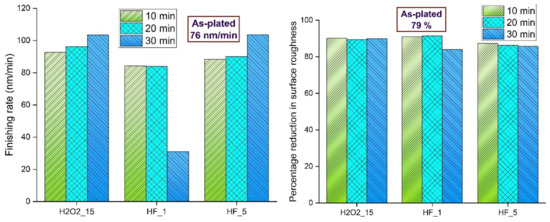 Figure 15 shows the finishing rate and percentage reduction in surface roughness of as-plated and chemically treated surfaces. The rate of finishing and the percentage reduction in surface roughness for the as-plated surface are 76 nm/min and 79%, respectively. The rate of finishing was higher for all chemically treated surfaces except the chemically treated with 1% HF and for a duration of 30 min. The primary reason for this is the lowest initial surface roughness after the chemical treatment. As the roughness was quite low as compared to other surfaces, this surface had lower peaks, which are more difficult to remove as compared to higher peaks. If the surface is too rough, material removal is easier initially due to sharp and gentle peaks. After that, the subsequent reduction in material removal becomes more difficult as the peaks are flattened and more surface is exposed. All the chemically treated surfaces have a higher percentage reduction in surface roughness when compared with the as-plated surface. These results support the hypothesis that material removal is made easy owing to a chemically modified surface and that a lower final roughness can be achieved on a chemically treated surface.