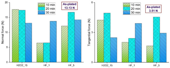 The two major finishing forces in MRF are the normal and tangential forces, which are responsible for the indentation of the active workpiece and the removal of material from the workpiece surface, respectively. The normal force acting on the interface by a single active abrasive is the sum of magnetic force, gravitational force, and centrifugal force. The tangential force acting on the interface is a shear force. The normal and tangential forces during MRF of as-plated and chemically treated surfaces are shown in Figure 16.