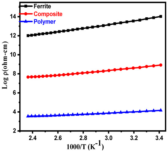 Furthermore, there is a lot of inter granularity, which makes the resistivity increase [34]. Nanocomposites have a lower resistance than pure ferrite. The resistance gets even lower as the temperature increases. The addition of ferrite to PPy-DBSA caused the resistivity to go down. FeCl3 was used to make the polymer, and as a result, a donor–acceptor complex was formed. In the future, a donor-acceptor conjugated system could be why there were so many quasi-particles (polarons or bipolarons).