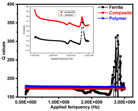 Variation of quality factor (Q) values with the frequency of Y-type hexaferrite Sr2Co2Fe12O22, composite (Sr2Co2Fe12O22 + PPy-DBSA), and polymer PPy-DBSA.