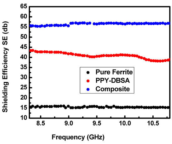 It is worth noting that SE also depends upon the complex function of the permittivity and permeability, the mathematical details are given elsewhere [56]. In general the SE of EMI strongly depends upon the frequency, the thickness of the sample, and conductivity of the materials. In the present study SE is calculated in the X band frequency region of Y-type hexaferrite, PPy-DBSA) and their composite [57,58]. Figure 11 shows the variation of SE of pure Y-type hexaferrite, conducting ppy-DBSA and their composite in the higher frequency range. It is observed that the pure Y-type hexaferrites and pure ppy-DBSA are neither the good absorber nor good reflector of the EM waves [59,60,61]. It is clear from Figure 11 that the composite of y-type hexaferrite/ppy-DBSA has higher shielding efficiency. The higher efficiency is due to the magnetic Sr2Co2Fe12O22 ferrite and conducting ppy-DBSA. The combined effect of the magnetic dipoles of ferrites and electric dipoles enhances the SE of the materials [62,63]. The total efficiency of the composite thus increases compared to the pure materials. The composite is thus a potential candidate for EMI shielding material due to its light weight with enhanced SE with wide bandwidth.
