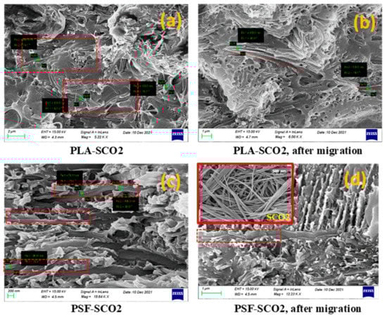 In Figure 1, representative SEM images of PLA-SCO2 and PSF-SCO2 composites in which the morphology of the SCO system is in nanowire formations, before (Figure 1a and Figure 1c, respectively) and after the migration release study (Figure 1b and Figure 1d, respectively), are presented; in the red box of the inset of Figure 1d the SEM image of the pristine SCO2 system is presented. The percentage of the SCO material in the polymer matrix is 10% w/w; this is also indicated in the EDX analysis of PSF:SCO samples (Figure S1). It seems that the SCO nanowires are successfully incorporated into both polymer matrices (squares in red dash line). However, after the migration process, residual cavities in the PLA matrix (red dashed lines) clearly indicate the release of nanowires, while in the case of PSF, no similar cavities are observed.
