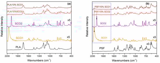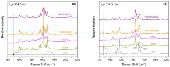 On the other hand, the Raman spectra of PLA-SCO and PSF-SCO composites reveal spectral contributions of both constituents; the SCO systems reveal their existence by characteristic peaks in the whole spectral range, with indicative stretching vibrations of PLA and PSF, respectively (indicated by arrows), being also present in the spectra.