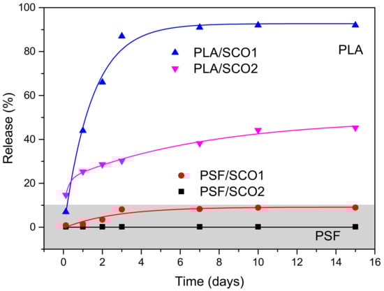 The percentage of SCO compounds (SCO1 and SCO2) released from PLA-SCO and PSF-SCO composites into the 50% EtOH solution as a function of time.