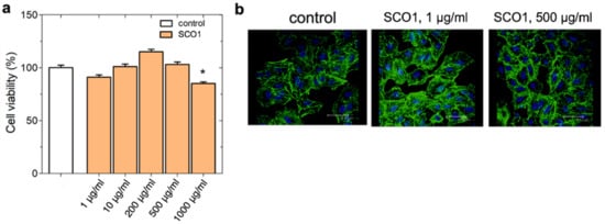 Effects of the SCO1 on cell viability and morphology: (a) cell viability following treatment of A549 cells with 1, 10, 200, 500, 1000 μg/mL of SCO1 for 24 h following WST-1 assay. The asterisk (*) indicates statistically significant difference (p ≤ 0.05); (b) immunofluorescence analysis of F-actin (green) in A549 cells with 0 (control), 1, and 500 μg/mL SCO1. Nuclei are stained with DAPI (blue).