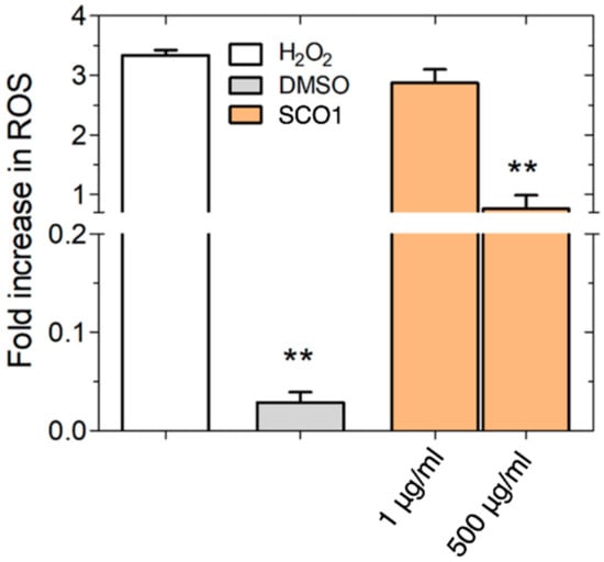 Effects of SCO1 on ROS production. A549 cells were treated with 1 and 500 μg/mL SCO1 for 24 h, and ROS production was monitored using the fluorescent dye DCFDA/H2DCFDA. H2O2 is positive control and DMSO was utilised as negative control of the method. Asterisks (**) indicate statistically significant difference (p ≤ 0.01).