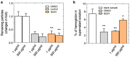 Evaluation of the stability of SCO1 on stimulated gastric fluid and haemoglobin release: (a) in vitro study of SCO1 release on stimulated gastric fluid using incubation with pepsin 0.32% w/v at pH 1.2; (b) assessment of the haemolytic potential of the respective materials represented as % of red blood cells haemolysis. DMSO was utilised as the positive control of both methods. Asterisks (*), (**) indicate statistically significant differences (p ≤ 0.05 and p ≤ 0.01, respectively).