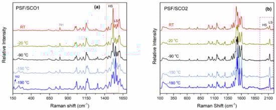 It is worth commenting that as the temperature decreases, differences in the Raman spectra of both PSF-SCO1 and PSF-SCO2 systems are clearly visible. The low concentration of the SCO systems in the polymers may hinder the convenient observation of the changes due to the SCO transition in the composites, especially in the low-frequency region. However, considerable changes could be monitored. For the PSF-SCO1 system, the most easily observed alterations in the spectra are located in the 1050–1600 cm−1 spectral region, attributed to internal modes of the abpt organic ligand. For the PSF-SCO2 system, apart from these differences in the low-frequency region (the intensity of the band at 162 cm−1, attributed to Fe-N stretching vibrations of the Fe(II) complex at the LS state, is increased as the temperature decreases), alterations of the peaks at 2000–2300 attributed to the C≡N stretching vibrations are also profound. To this end, the intensity of some of the bands increases with the reduction in the temperature, while the intensity of others increases. The first bands may be attributed to the HS species, while the latter to the LS species. A characteristic example is the pair of the abpt vibrational modes at 1518 cm−1 and 1548 cm−1 for the SCO1 system, which are included in the dashed square of the spectra in Figure 8a. The progressive intensity alteration of these bands indicates the transition of the system from the HS to the LS states as the temperature is decreased. For the SCO2 system, the CN vibrational modes exhibit the same behaviour [10]. The intensity of the 2089 cm−1 band attributed to the HS species decreases with a reduction in temperature, while the intensity of the 2128 cm−1 band attributed to the LS species increases (dashed square in Figure 8b).