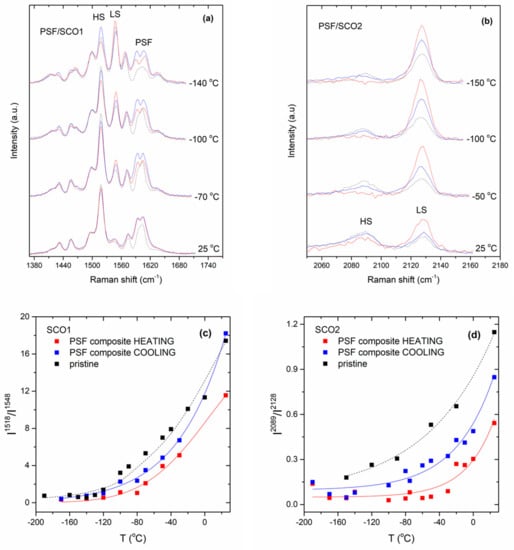 The normalised temperature-dependent Raman spectra of PSF composites in the spectral regions of interest (dashed squares in Figure 8), i.e., the characteristic abpt internal modes for SCO1 and the CN modes for SCO2, are presented in Figure 9a,b, respectively. In these figures, the Raman spectra of the composites for the transition from the LS to HS state (red line, the spectra were obtained in a heating mode) and the transition from the HS to LS state (blue line, the spectra were obtained in a cooling mode) were collected; the corresponding spectra of the pristine SCO materials are illustrated with a black dashed line for comparison. It is noticeable that in both composites, an upshift of the transition (LS population for the case of composites is systematically greater than the corresponding one for the pristine coordination complexes) and a hysteretic behaviour were recorded; no hysteretic behaviour of the SCO pristine materials (SCO1 and SCO2) was detected [10,18]. These alterations may be attributed to possible PSF-SCO1 interactions. These features were more intensely observed in the PSF-SCO2 system. The HS↔LS transition may be easily resolved in plots of Raman peaks intensity ratio as a function of temperature; the ratio should involve vibrational bands associated with the HS and LS species. Such plots for the PSF composites of SCO1 and SCO2 systems are shown in Figure 9c,d. More specifically, for the SCO1 composite, the intensity ratio of the 1518 cm−1 and 1548 cm−1 bands which are internal abpt vibrational modes of the HS and LS species, respectively, is plotted as a function of temperature. For the SCO2 composite, a similar plot is depicted using the 2089 cm−1 and 2128 cm−1 peaks characteristic of the corresponding HS and LS species. A significant shift of the transition to higher temperatures is clear for both composites if compared with the transition of the pristine SCO materials. The shift of the transition is furthermore justified by the persistence of the vibrational modes attributed to the LS species in the Raman spectra recorded at ambient temperature during the heating cycle; the species are eliminated when the temperature is further increased (Figure S4). Moreover, both composites exhibit hysteresis during the cooling and heating runs, although for both SCO systems in the pristine state, no hysteresis is observed. Both shift and hysteric effects generated by the incorporation of the SCO systems in the polymeric matrix are more intense for SCO2. From the basic research viewpoint, the estimation of the HS population as a function of temperature is of great importance; however, its extraction requires careful handling of the Raman cross-section of the bands used to signify the HS and LS species. This task is beyond the target of the current study; nevertheless, the qualitative results obtained which indicate the shift of the transition towards the effective temperature window for applications in the food sector (−50 °C to ambient), along with the hysteretic effects introduced by the polymer matrix, highlight the practical importance of such materials as temperature indicators. However, further intensive research is required; this study could be considered the stepping stone for future optimisation of the process.