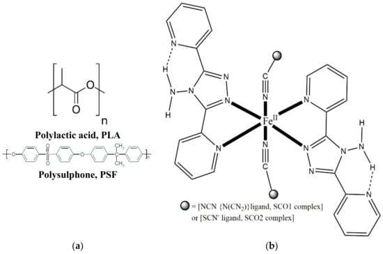 (a) Schematic representation of the chemical structures of polylactic acid (PLA) and polysulphone (PSF); (b) schematic representation of the structural formulae of the octahedral SCO complexes SCO1 and SCO2 (SCO1 is [Fe{N(CN)2}2(abpt)2] and SCO2 is [Fe(SCN)2(abpt)2]).