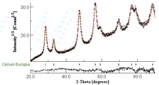 XRD pattern (black curve) and Rietveld refinement plot (red curve) of Eu3+(1%)-doped CeO2 nanocrystalline powder calcinated at 500 °C; the lower trace represents the difference curve between observed and calculated patterns.