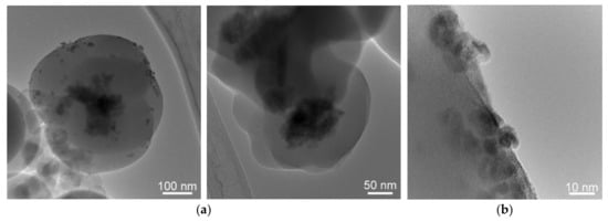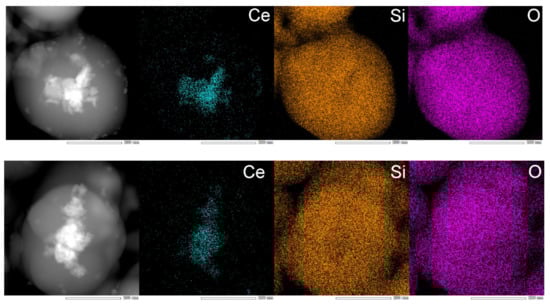 The nature and the dispersion of the nanoparticles inside the silica spheres were revealed by scanning transmission electron microscopy (STEM) images in dark field mode. They showed a central region consisting of elements with higher atomic numbers, as it appears brighter than the surrounding material, as it is the case of Ce atoms compared with Si. The STEM-EDS mapping images revealed the presence of CeO2 nanocrystals mainly in the core region of the sphere but also partially dispersed in the volume (Figure 5).