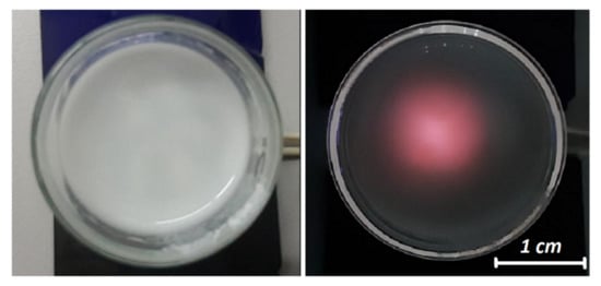 The visual observation of a solution of SiO2-CeO2:Eu3+(1 mol%) silica nanospheres solution (in ethanol) under 360 nm UV-light excitation showed a red-pink luminescence due to the Eu3+ luminescent ions (Figure 6).
