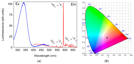 Photoluminescence and excitation spectra of SiO2-CeO2:Eu3+(1 mol%) silica nanospheres (a) and the chromaticity coordinates of the Commission Internationale de l’Eclairage (CIE) chromaticity diagram (b).