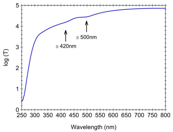 Finally, interesting features are revealed by the optical transmission spectra recorded on SiO2-CeO2:Eu3+(1 mol%) nanospheres deposited as thick films on quartz plates (Figure 8); the visual observation of iridescence might suggest photonic properties [26]. As expected, the spectra showed transparency in the whole visible and blue region down to 300 nm and strong absorption in the UV region due to the silica matrix. In addition, there are two weak attenuation peaks at 420 and 500 nm in the range expected for Bragg reflection from different planes [26,27] in the fcc structure, most probably (200) and (111) (Figure 8). The peaks position can be computed by the Bragg low at normal incidence and are dependent on the value fraction of the silica spheres in a close-packed structure and the refractive index of the silica spheres [27]. In the present case, their position is different from that reported at about 450 and 600 nm in [27], and they are very weak because of the poor packaging of the silica spheres (Figure 3), and the dispersion of the SiO2-CeO2:Eu3+(1%) nanospheres refractive index is different compared to silica spheres (due to the nanocrystals).
