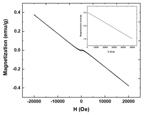 The magnetic properties of the SiO2-CeO2:Eu3+(1%) spheres are revealed by the magnetization vs. applied magnetic field dependence which indicates a diamagnetic behavior up to higher magnetic fields (Figure 9). In general, the magnetic properties of CeO2 are influenced by the morphology, defect structure and impurities [15,16,17,18,19] through the oxygen vacancies and structural defects. Moreover, it was shown that the CeO2 magnetic behavior is strongly influenced by the nanocrystals’ dispersion in powders: the magnetism is reduced up to an order of magnitude and there is a characteristic length scale of the order of 100 nm for the magnetism to appear in CeO2 nanoparticle clusters [28]. In the present case, the diamagnetic behavior is dominantly given by the silica matrix, where the nanocrystals are incorporated and CeO2 magnetism is not observed. However, the presence of CeO2:Eu3+(1%) nanocrystals is revealed by a light open hysteresis loop observed at a very small magnetic field (about 0.005 Oe), which is due to the interaction between the two rare earths, Eu and Ce; the high number of 4f electrons causes an increase in the strength of the orbital couplings between the two ion sublattices.