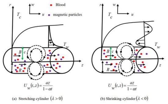 The study of biomagnetic fluid dynamic (BFD) has attained serious attention from researchers over the last few decades because of its wide range of applications in the biomedical and bioengineering sector including magnetic resonance imaging (MRI), in cancer therapy (hyperthermia), magnetic drug and gene delivery, magnetic separation, reducing blood during surgeries, tissue engineering as early mentioned by [,,,,] as theoretically and experimentally. However, to the author’s best knowledge, the study of a biomagnetic fluid model (blood flow model) containing magnetic particles through an unsteady stretching/shrinking cylindrical has not been studied yet so far. Thus, the main concern is to fill up this gap from the present analysis. The reason behind that is that magnetic particles play a vital role in modern medicine and pharmacology areas due to unique magnetic features which are not present in other materials. For example, in cancer treatment magnetic particles are transferred into cancer cells and enhance the heat (using the hyperthermia therapy method) in presence of an applied magnetic field. As a result, the tumor cells are shrunk without any prejudice of normal tissue and the overall therapy is covered at a very low cost. The most common example of biomagnetic fluid is blood. Blood is deliberated as magnetic fluid due to the presence of red blood cells that contain the hemoglobin molecule which is also a form of iron oxide that is present at a uniquely high concentration in the mature red blood cells [,].