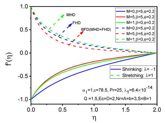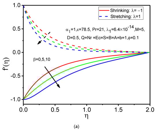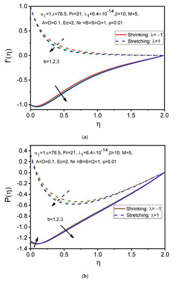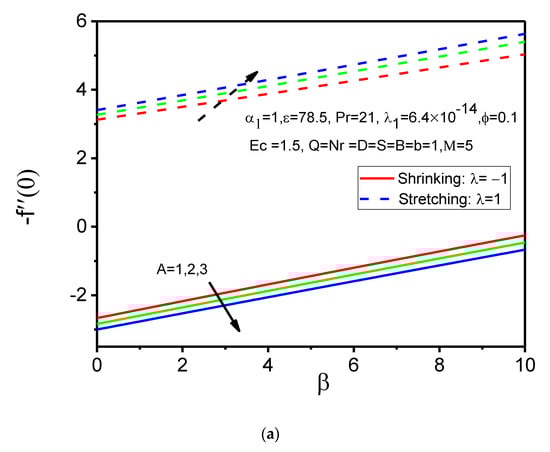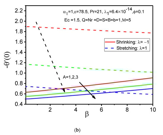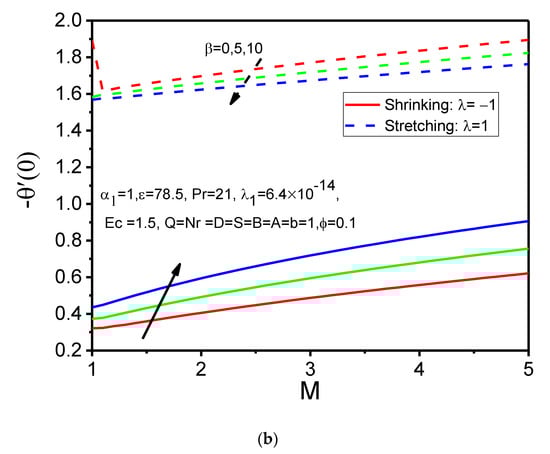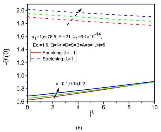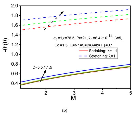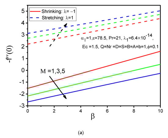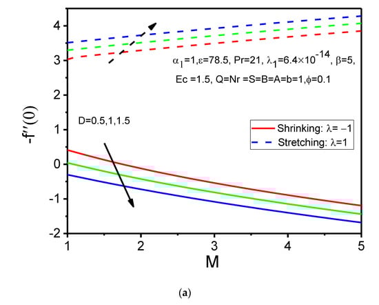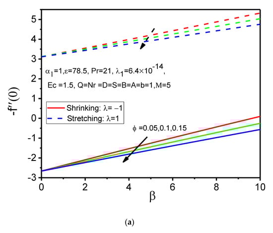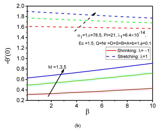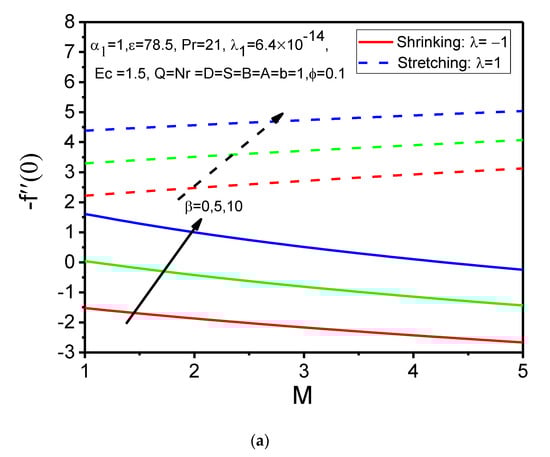 Figure 13, Figure 14, Figure 15, Figure 16 and Figure 17 exhibit the skin friction coefficient and rate of heat transfer for several values of the ferromagnetic interaction parameter, curvature parameter, magnetic field parameter, volume fraction of magnetic particles and unsteadiness parameter. Figure 13a and Figure 14b depict the variation of skin friction coefficient and rate of heat transfer for ferromagnetic number and curvature parameter, respectively with regard to the magnetic field parameter for stretching and shrinking cases. From Figure 13a, it is seen that increment values of  skin friction  are enhanced in both cases. The reverse behavior is noticed for the rate of heat transfer (see Figure 13b); where  decreases for the stretching case while increases for the shrinking case. Moreover, for increasing values of the curvature parameter with respect to the magnetic field parameter, two different types of behavior are observed for . The skin friction coefficient  is increased for the stretching case and the opposite occurs for the shrinking one. On the contrary, for both stretching and shrinking cases  is increased as  is enhanced.