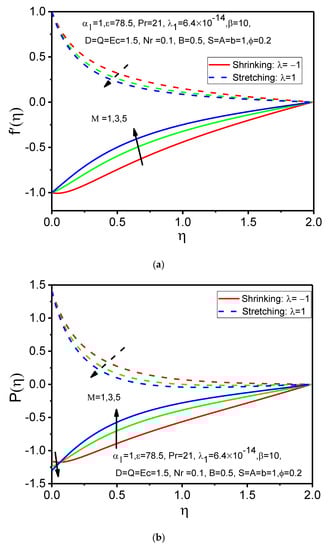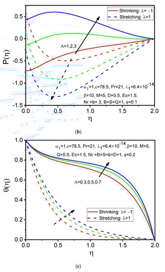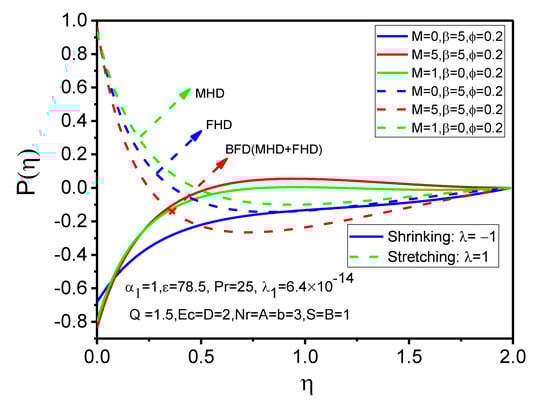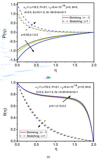 Figure 8 depicts the effect of volume fraction of magnetic particles on the axial velocity, pressure and temperature profiles. It is clearly seen from Figure 8a that fluid velocity is significantly increased with enhancing values of volume fraction on both stretching and shrinking cases. From the temperature profile (Figure 8c) we noticed that temperature profiles are enhanced for the shrinking mode when the values of the volume fraction are gradually increased but the reverse behavior is observed for the stretching case. This is expected because in large cylindrical surface area magnetic particles produce high thermal conductivity which causes raising of the thermal boundary layer. The reverse type of behavior is visible in Figure 8b which shows that with increasing values of volume fraction of the magnetic particles the pressure is enhanced for the stretching case while it is reduced in the shrinking mode.