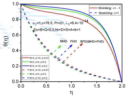 - It is obtained temperature profile diminution with the volume fraction of the nanoparticles for the stretching mode, whereas it is raised for the shrinking case.