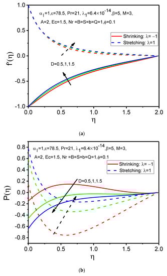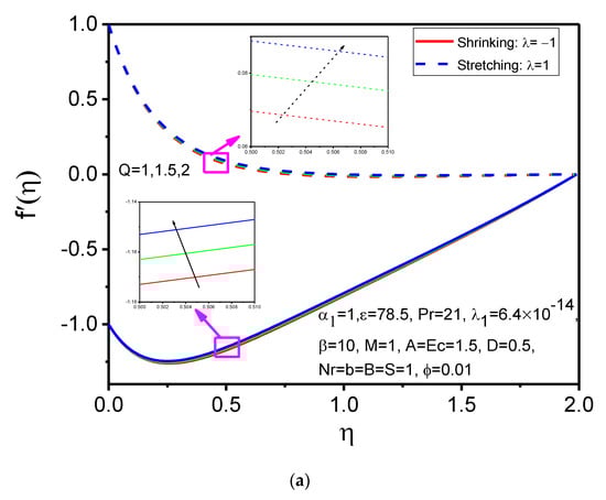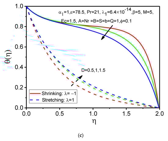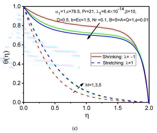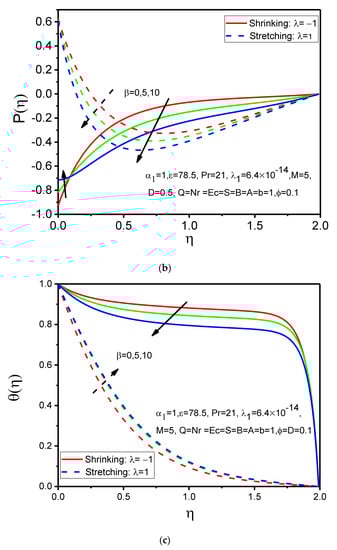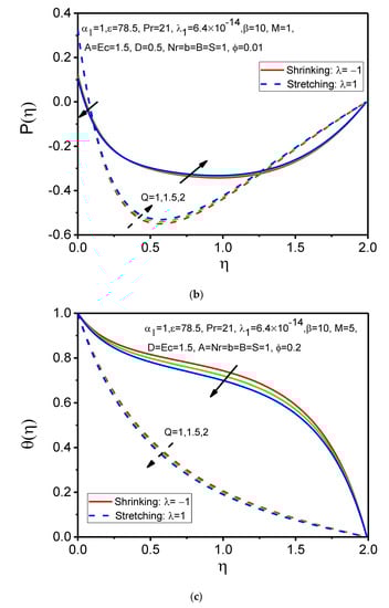 The impact of heat source on velocity, pressure and temperature profiles is displayed in Figure 12. From Figure 12a,b it is observed that the velocity and pressure profile is increased in both cases, i.e., stretching and shrinking with incremental values of the heat source parameter. However, reverse behavior can also be found in Figure 12c, where it is obtained that the temperature profile decreases in both cases and such kinds of results are also found in the study of [].