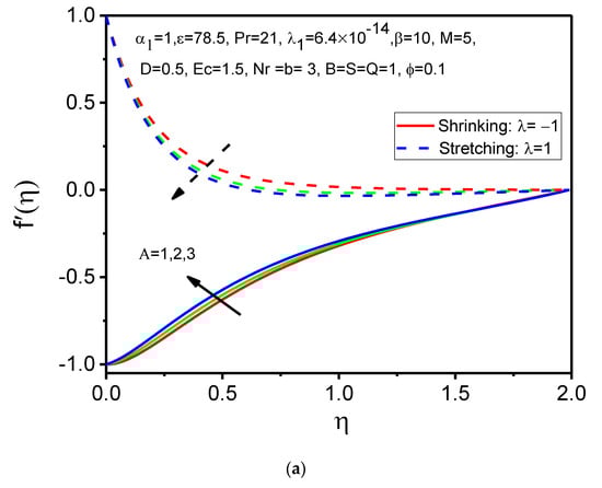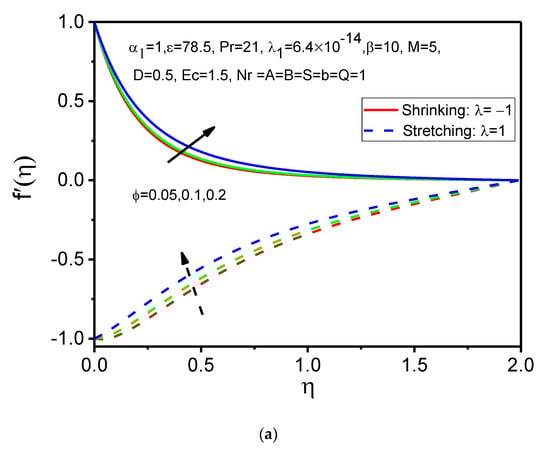 The variation of the temperature gradient, i.e., wall heat transfer rate under the influence of magnetic field parameter, the volume fraction of magnetic particles and unsteadiness parameter with regard to ferromagnetic interaction parameter is shown in Figure 15a to Figure 17b. From those figures, it is observed that  is increased only for the stretching case with the magnetic field parameter and the unsteadiness parameter but decreased when the cylindrical surface is shrinking. It is also noticed that in both stretching and shrinking cases  is enhanced when the values of the magnetic field parameter are increased. The reverse is happening in similar cases for the unsteadiness parameter (see Figure 17b). Most importantly it is obtained that when the values of the volume fraction of magnetic particles increases,  is decreased and opposite acts are found for the variation of  for both cases of stretching and shrinking.