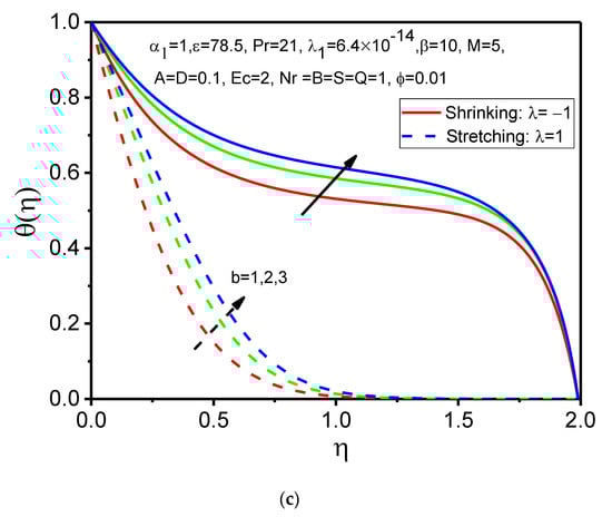 Figure 10 shows the variation of thermal conductivity parameters on the axial velocity, pressure and temperature profiles. Figure 10a signifies the effect of  on axial velocity profile and it is seen that for both stretching and shrinking mode the velocity profile decreases with increasing values of the thermal conductivity parameter. Additionally, from Figure 10b, one can easily observe that the pressure profile is increased for the stretching case, but two different configurations can identify a shrinking case where pressure distribution is increased rapidly in the boundary layer region of approximately . In Figure 10c it is concluded that when the values of the thermal conductivity parameter are gradually increased, the temperature profile is enhanced and this is happening in both stretching and shrinking cases. The reason behind that is that in this model it is considered that the thermal conductivity varies linearly with temperature. As a result, when the velocity profile decreases, the temperature profile increases as the values of the thermal conductivity parameter are enchased.