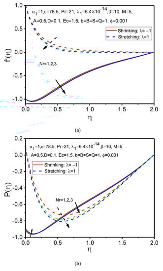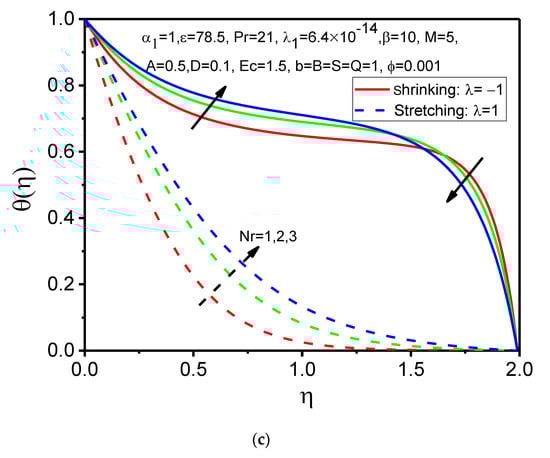 Figure 11 show the effect of radiation parameter on the velocity, pressure and temperature distributions, respectively. Where in Figure 11a, it can be easily observed that the velocity profile is declined as the values of Nr are enhanced in both configurations of stretching and shrinking cylinder. The pressure profile (see Figure 11b) is also decreased for the stretching case, but the reverse trend occurs when the sheet is in shrinking mode. On the other hand, Figure 11c identifies that temperature profiles act in two different ways. When the cylindrical sheet is assumed stretched, fluid temperature is increased but for the shrinking case the fluid firstly is enhanced and hereafter is decreased in the boundary layer region, say for . The temperature profile is more pronounced than that of the velocity and pressure profiles. This is happening because when values of the radiation parameter enlarge, surface heat flux is getting higher. As a result, fluid-like blood becomes warmer; which causes enhancement of the temperature profile and consequently, the velocity profile decreases.