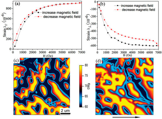 The magnetostrictive strain and MFM phase images of the Terfenol-D disk at saturated magnetization (a) parallel, (b) perpendicular to the applied magnetic field; (c) MFM phase image before, (d) after magnetization [67].