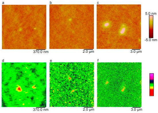 Atomic force and magnetic force microscopy measurements of iron oxide nanoparticles embedded in a resin layer. Topography of 10 nm nanoparticles in a 25 nm layer (a), 20 nm nanoparticles in a 150 nm layer (b), and 80 nm nanoparticles in a 350 nm layer (c). Negative phase shifts due to the attractive magnetic force are observed in corresponding phase images (d–f). The color scale is −1 to 1° in (d), −0.25 to 0.25° in (e), and −0.1 to 0.1° in (f). All phase images were taken in 15 nm lift height. These data were reprinted from Ref. [74] with permission from Wiley Online Library.